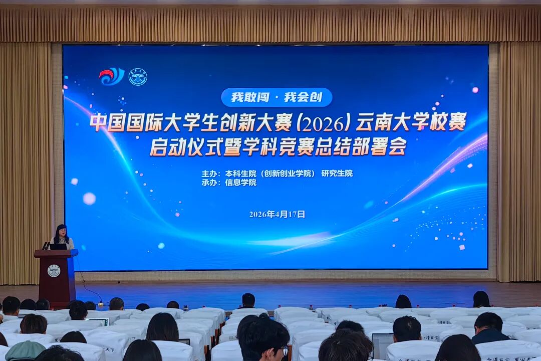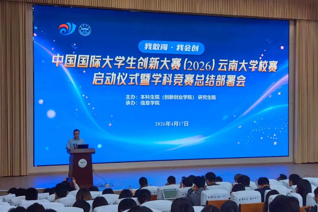 2026年4月17日,中国国际大学生创新大赛(2026)云南大学校赛启动仪式暨学科竞赛总结部署会在学校举行。会议全面总结回顾了2025年学校创新创业教育及学科竞赛工作成效,表彰在各级各类学科竞赛中取得优异成绩的师生团队,并安排部署2026年创新创业竞赛及学科竞赛重点工作任务。本科生院(创新创业学院)、研究生院及相关职能部门负责人,各学院分管创新创业教育工作负责人,获奖师生代表及参赛团队代表等参加会议。