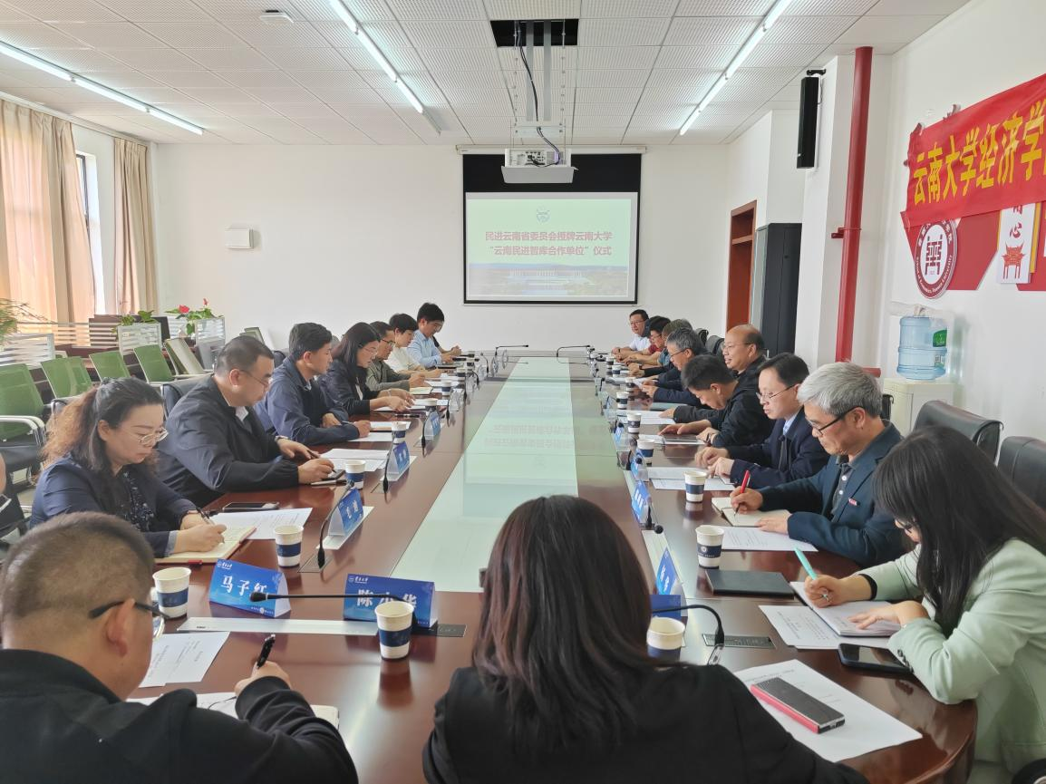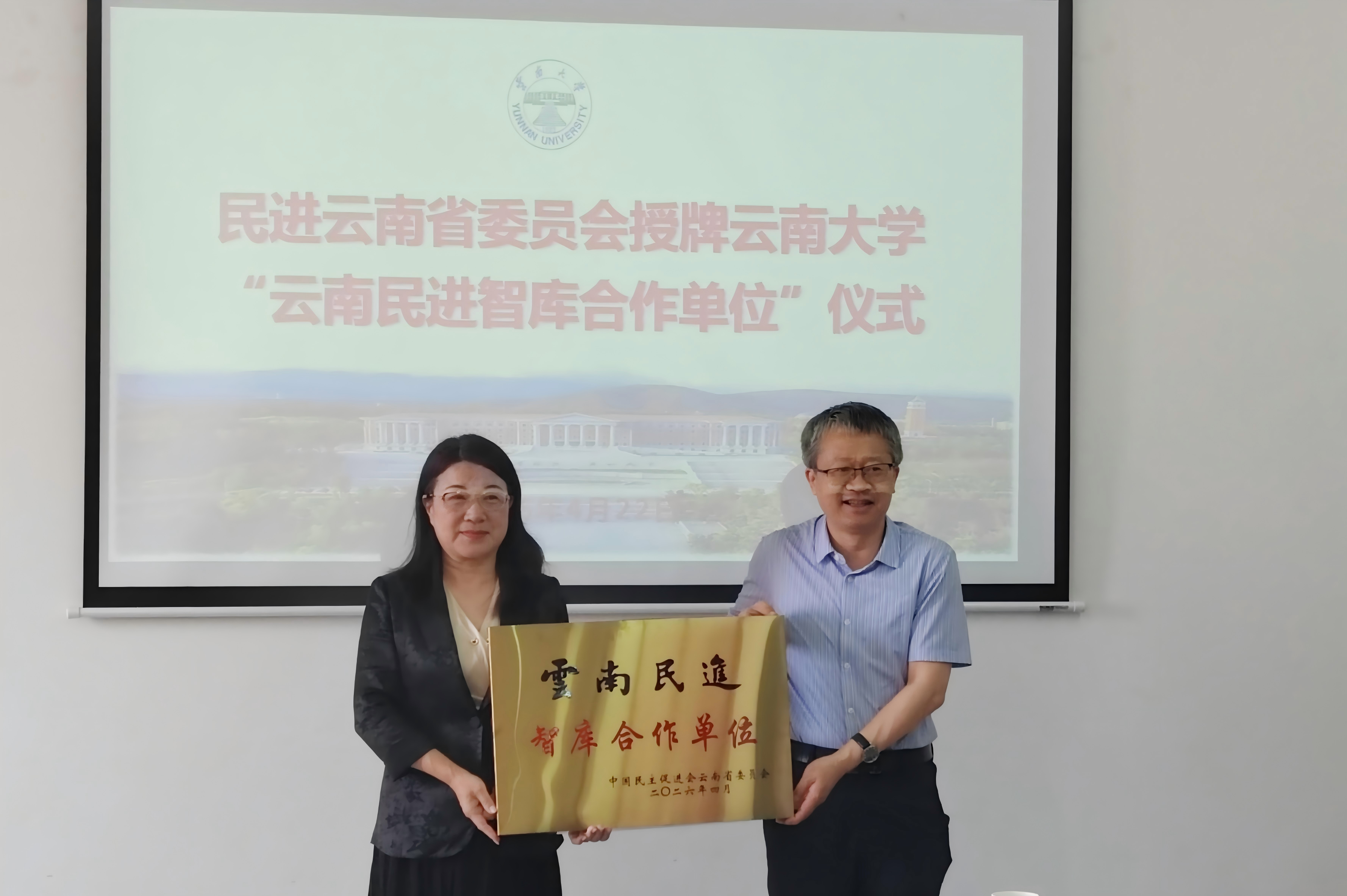 2026年4月22日,民进云南省委员会授牌云南大学“云南民进智库合作单位”仪式在云南大学举行。省政协副秘书长、民进云南省委会专职副主委金振辉,民进云南省委会秘书长马孟杰,云南大学副校长杨绍军,以及双方相关处室、职能部门及学校教学单位的负责人参加授牌仪式。