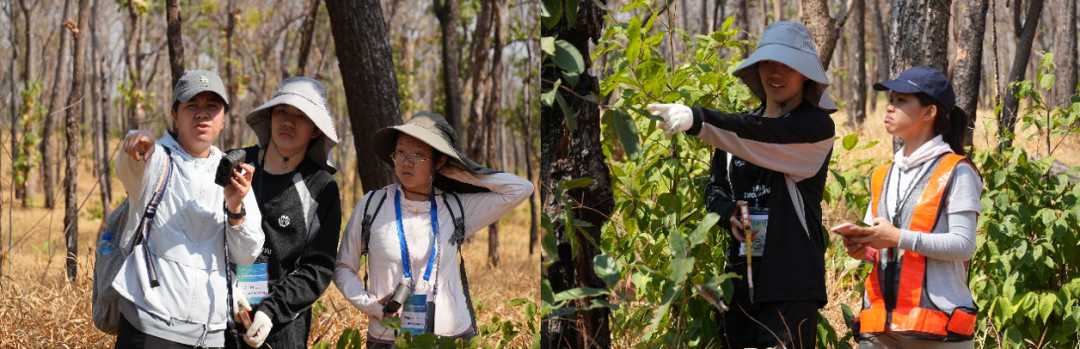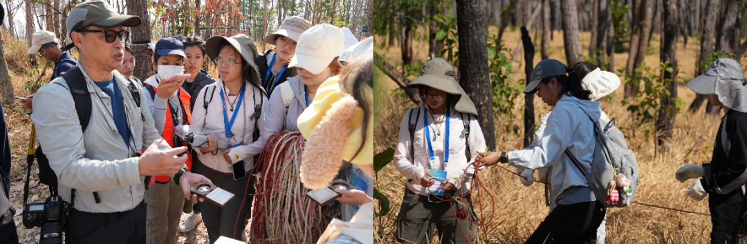 野外调查阶段,中泰师生在呵叻府王努姆卡森林研究与实习站周边,针对干旱常绿森林与落叶龙脑香科森林两类典型热带森林生态系统开展系统性生态调查。学生们分组协作,严格遵循标准生态学方法布设样方,完成树木胸径与树高测量、林冠覆盖度估算、土壤pH值测定及样本采集等工作,并现场测定典型树种的叶片功能性状。