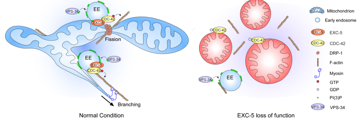 为系统探究参与线粒体网络形成和维持的调控因子,本研究以秀丽线虫为模型,筛选线粒体网络形成异常的突变体。通过大规模、无偏好正向遗传学筛选,发现EXC-5/FGD突变会导致线粒体网络化受损、动态破坏,呈现不连续的球状表型。动态追踪显示,EXC-5形成点状蛋白并与线粒体动态发生密切相关。EXC-5的人类同源蛋白FGD家族,通过其鸟核苷酸交换因子(GEF)功能调控细胞内肌动蛋白(actin)的网络化。本研究发现,EXC-5与由PI 3-激酶VPS-34产生的PI(3)P结合,进而招募到内吞体-线粒体接触点,在那儿EXC-5作为GEF激活CDC-42 GTP酶发挥作用。因此,exc-5或vps-34缺失同样会破坏线粒体和肌动蛋白的网络化,影响线粒体分裂因子DRP-1向线粒体聚集,导致线粒体分裂、分支和延伸等动态过程受阻。反之,当过表达组成型激活的CDC-42时改善了线粒体网络化的缺陷。综上所述,本研究发现了一条PI(3)P- EXC-5-CDC-42信号轴在内吞体-线粒体接触位点介导肌动蛋白组装,进而调控线粒体动力学与网络化稳态的分子机制。