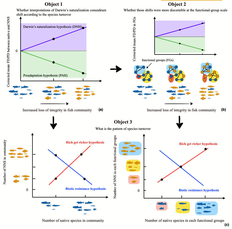 发表于 Functional Ecology 题为“Changing fish invasion patterns associated with community fish species turnover in 15 Chinese plateau lakes”的论文中,研究团队通过功能相似性网络分析,更精细地追踪了生物入侵下群落物种更替过程中物种之间功能关系的动态变化,解释了外来物种与本土群落在功能组层面的相似性如何随物种更替而发生转变,从而为长期存在的达尔文归化悖论提供新的解释视角。进一步地,发表于 Journal of Animal Ecology 题为“Loss of distinct functionality during fish community disassembly”论文,应用功能相似性网络分析刻画了群落在物种消失与新增过程中功能结构的重排过程,阐明了群落独特功能的丧失以及功能空缺难以被外来种有效补偿的结构性原因。