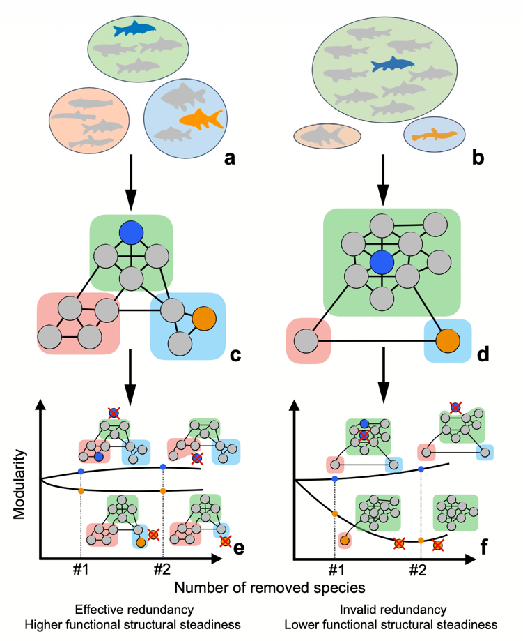发表于 Ecology Letters 题为“Functional vulnerability arises from unsteady trait-based networks despite high redundancy”的论文中,团队构建了功能相似性网络分析框架,并以澜沧江-湄公河鱼类群落为分析对象,发现鱼类群落即使具有较高的功能冗余,仍可能在扰动下表现出较高的功能脆弱性。造成这一现象的关键并不只是功能冗余的多少,而是相似功能在群落内部如何被组织以及这种组织是否稳健。该研究通过功能相似性网络分析刻画群落功能结构的稳健程度,揭示了“高冗余但仍脆弱”的结构性原因,为淡水生态保护提供了理论依据,也为生态功能风险的早期识别提供了新的思路。