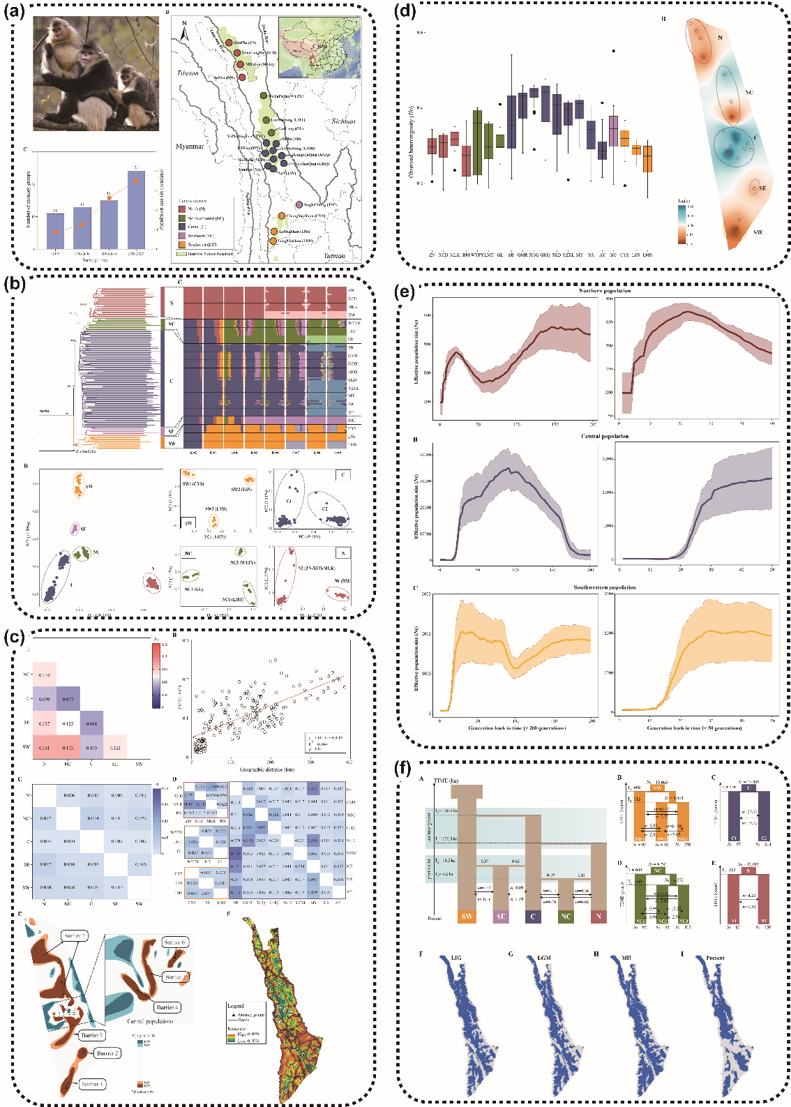 图1.滇金丝猴遗传结构和群体历史研究。(a)滇金丝猴种群分布及数量的历史调查;(b)群体结构分析;(c)基于景观遗传学分析识别出的遗传阻碍;(d)遗传多样性空间分布;(e)近期群体动态历史分析;(f)基于群体历史模拟的起源及扩散历史分析,以及生态位模拟分析。
