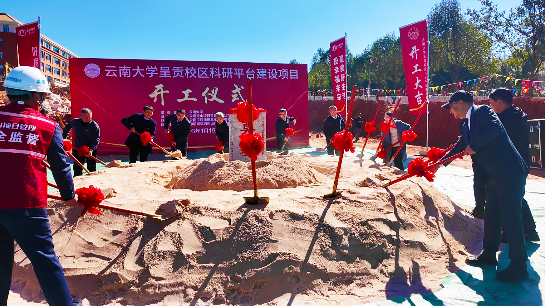 2026年1月19日,云南大学举行呈贡校区科研平台建设项目开工仪式。校领导周学斌、马文会、张玮、吴建德、王爱平、陈克清、段兴武、丁恒道,中国建筑西南设计研究院有限公司总监、区域总经理赵彦翔,云南省建设投资控股集团有限公司党委委员、副总经理杨国文,云南工程建设总承包股份有限公司党委副书记、副董事长、总经理王永钿,以及学校、施工单位相关部门负责人出席仪式。