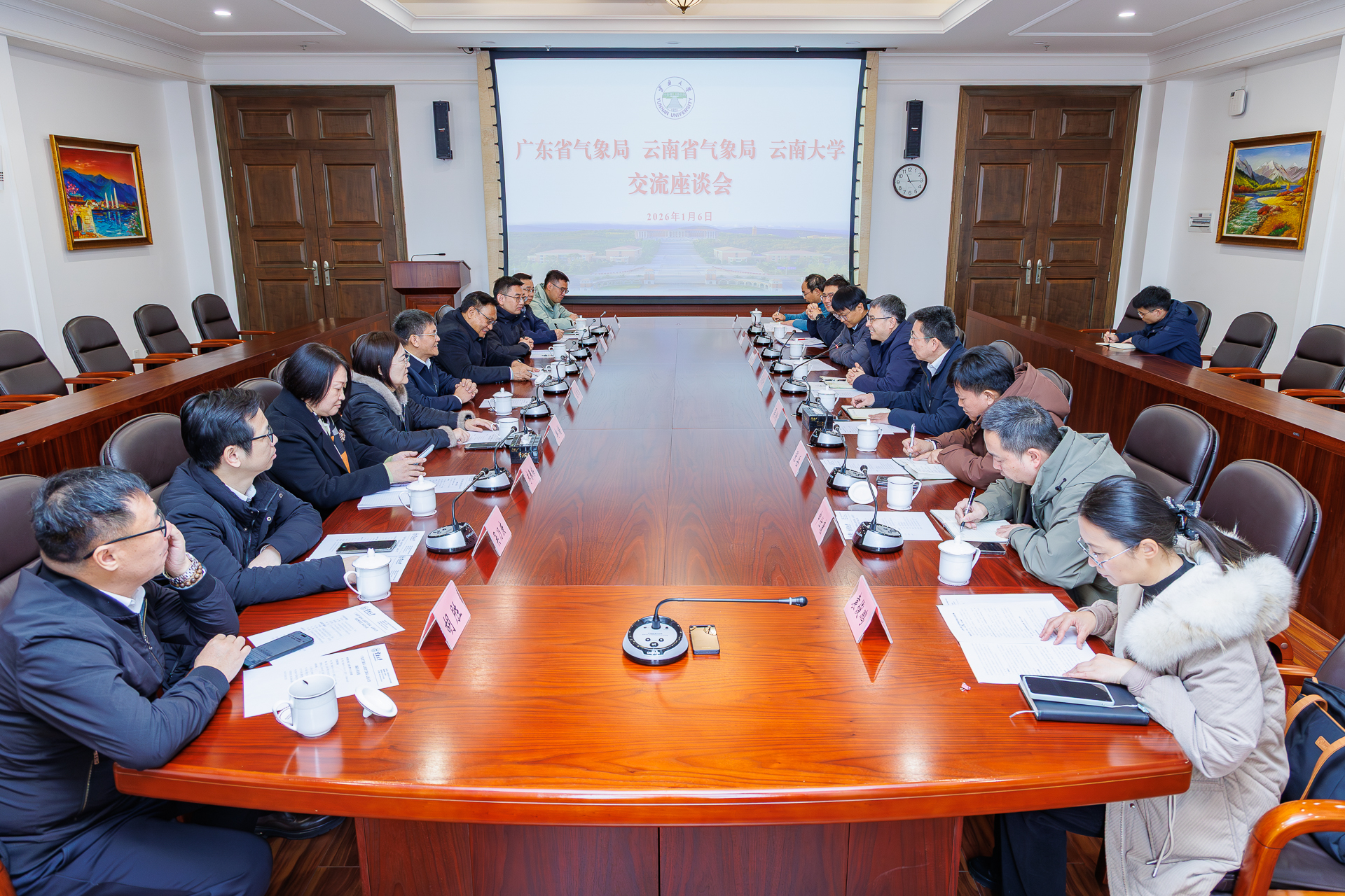 2026年1月6日,广东省气象局、云南省气象局和云南大学交流座谈会在云南大学举行。三方就气象科技创新、人才培养以及服务国家战略与区域发展等议题展开了深入探讨。广东省气象局局长庄旭东,云南省气象局局长尹晓毅、副局长黄玮,云南大学党委书记周学斌,校长马文会,副校长吴涧、段兴武,以及各方相关职能部门负责人参加座谈会。