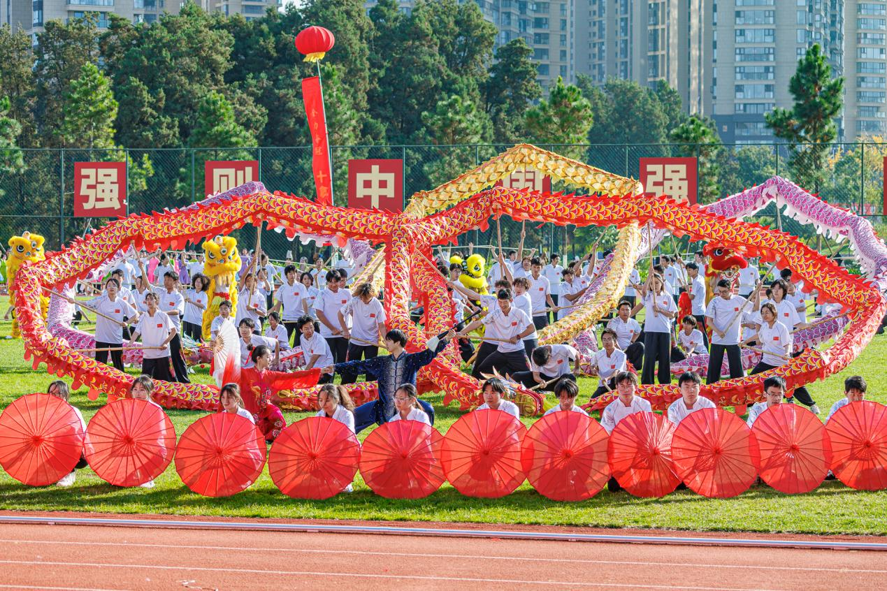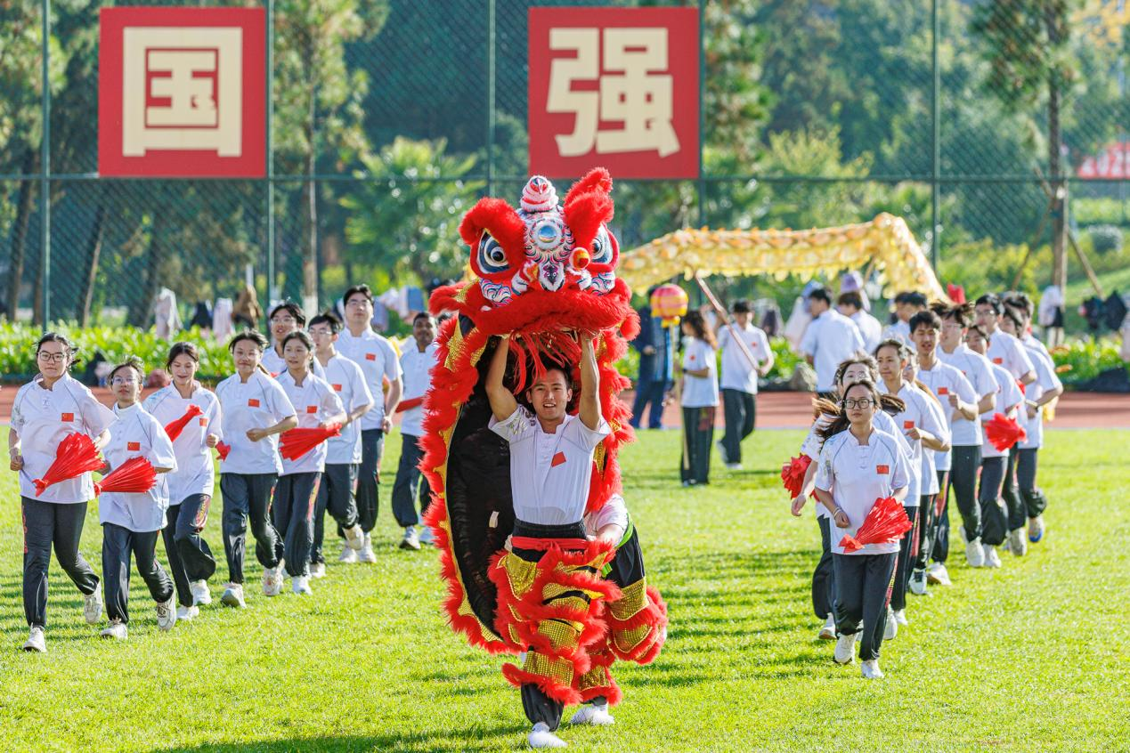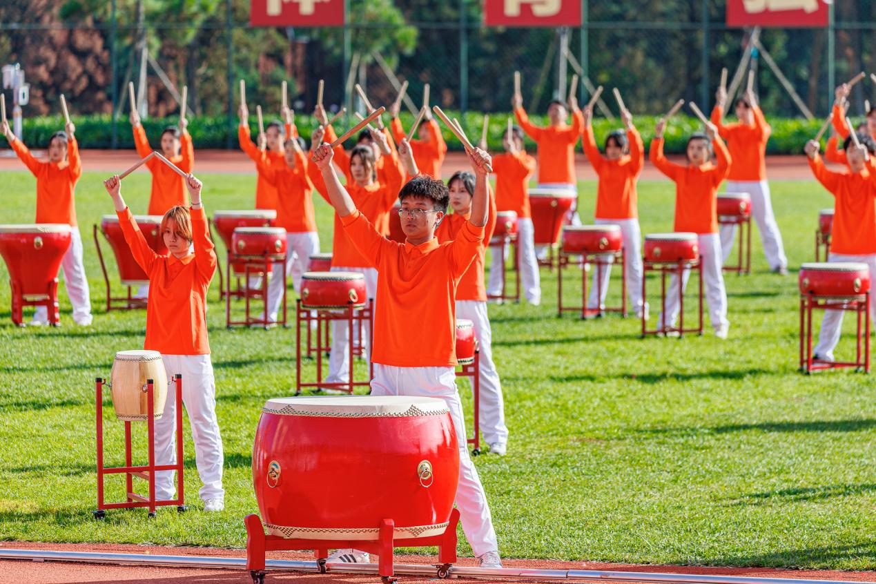 在入场式后,举行了体育文化节体育美育成果展演。三个风格鲜明的表演节目依次登场,以多元的艺术语言展示了云大学子的青春风采与蓬勃朝气。各学院公共体育课学生带来的《龙骧狮跃·棍伞承风》,以传统龙狮腾跃的豪迈气势为基调,融入棍法与伞技的翩跹灵动,在力量与韵律的交织中,展现中华优秀传统文化与当代体育精神的完美融合,赢得阵阵掌声。集体舞《飞扬舞韵,青春“恰”好》,以充满活力的舞步和流畅多变的队形,展现出青年学子昂扬向上的风姿。由艺术与设计学院学生倾情呈现的《风华正茂》,以铿锵有力的鼓点节奏,配合富有张力的肢体语言与整体编排,传递出新时代青年锐意进取的蓬勃力量,将全场气氛推向高潮。