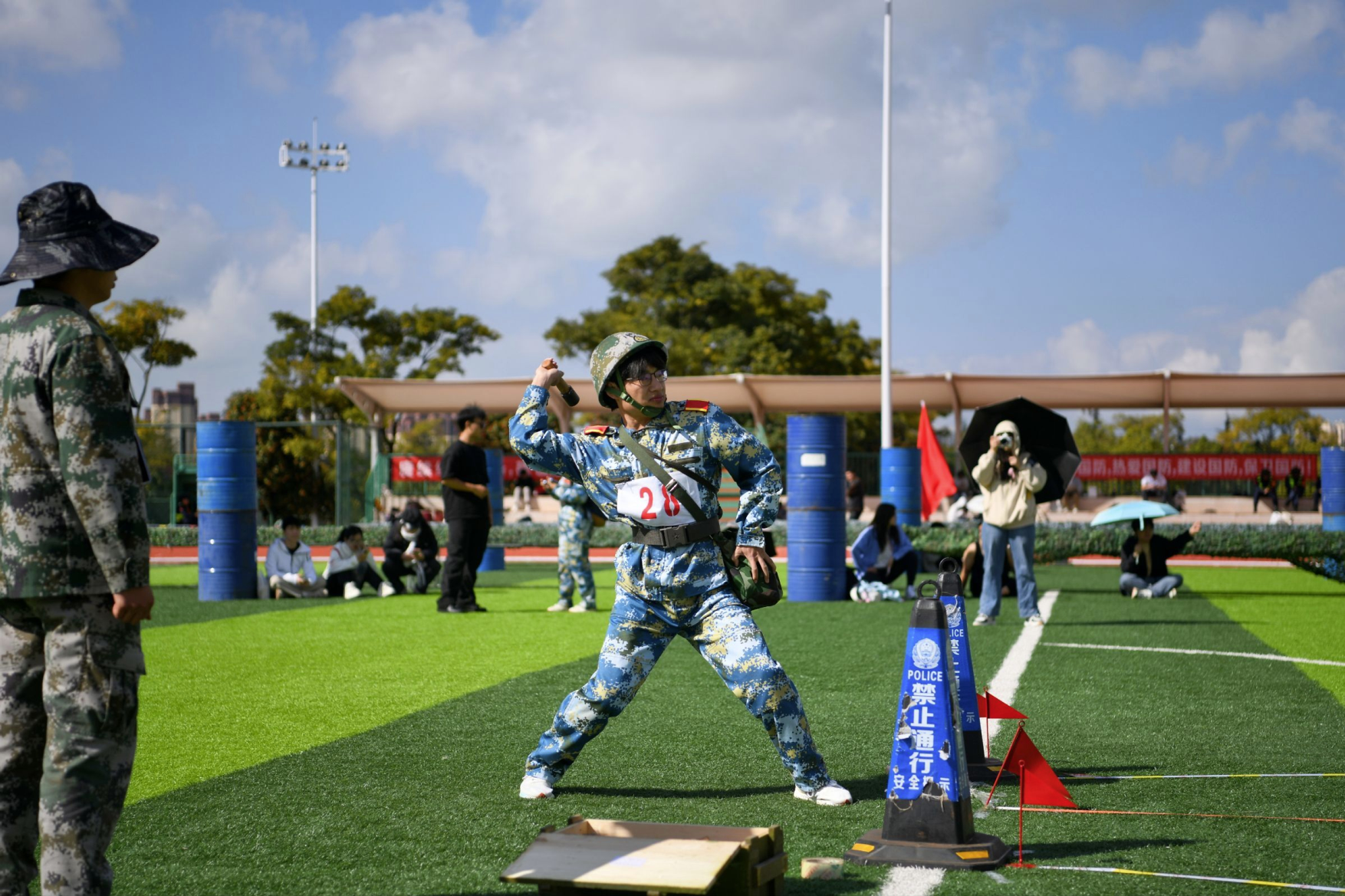 本次体育文化节为期三天,除了传统的田径运动会、师生消防运动会、教职工趣味运动会三个大项外,今年还新增了国防体育运动会大项,设置了男女手榴弹投掷、30*2蛇形跑、战术科目组合、防护负重射击组合等小项。这些新增项目将军事技能与体育竞技巧妙融合,增强了国防意识和团队协作能力,为师生们提供了一个展示自我、挑战极限的全新舞台。此外,在田径运动会的混合项目中新增了师生男女混合拔河项目,既吸引了更多师生参与,又增进了师生间的交流与互动。
