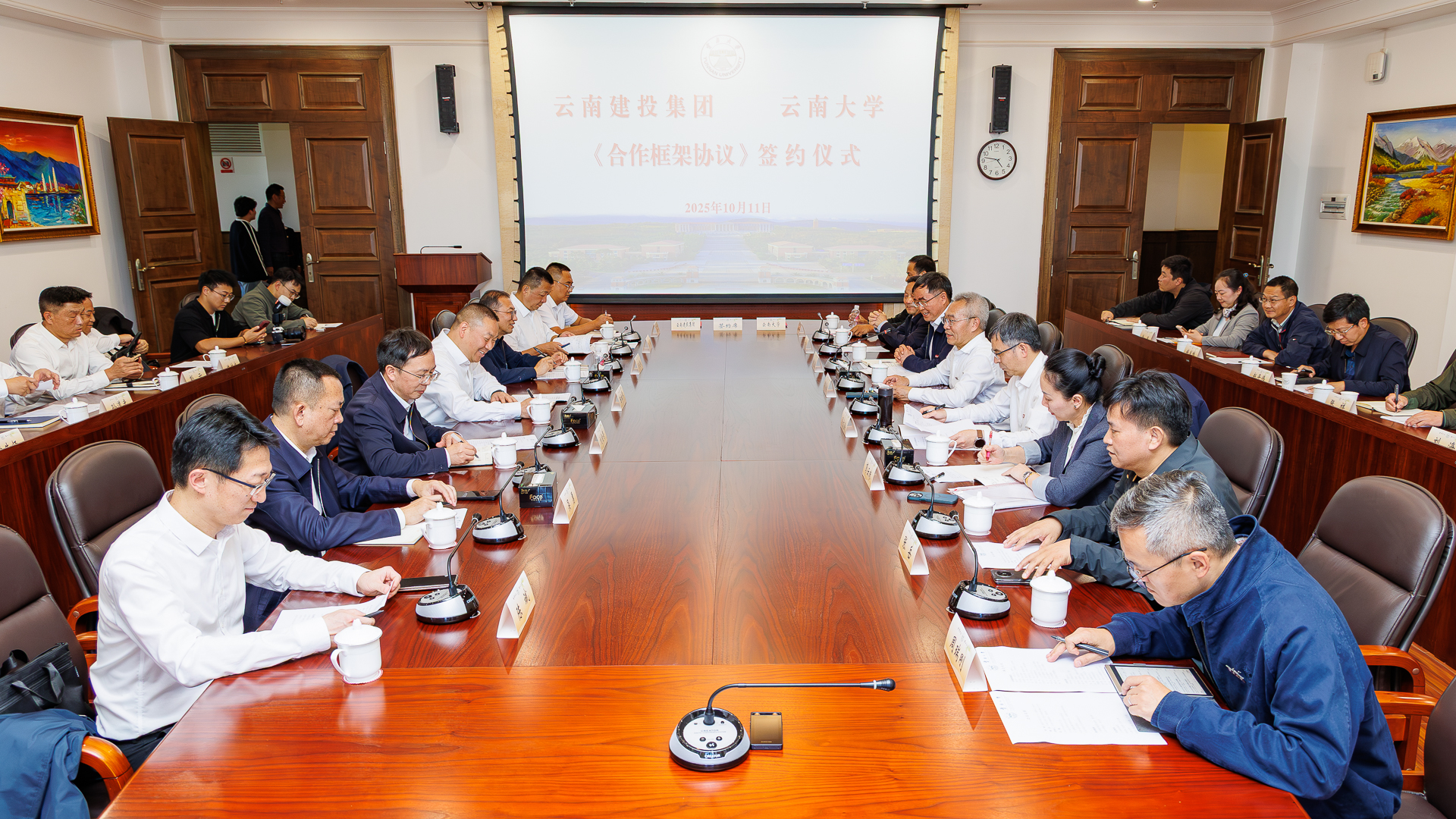 2025年10月11日,云南大学与云南省建设投资控股集团有限公司举行座谈交流会、签署合作框架协议。云南建投集团党委书记、董事长陈祖军,党委副书记、副董事长、总经理陈宙翔,副总经理刘金荣、王伟,云南大学党委书记周学斌,党委副书记、校长马文会,副校长陈克清,副校长、附属医院院长彭云珠,副校级领导丁恒道,以及双方相关职能部门或分公司负责人参会。