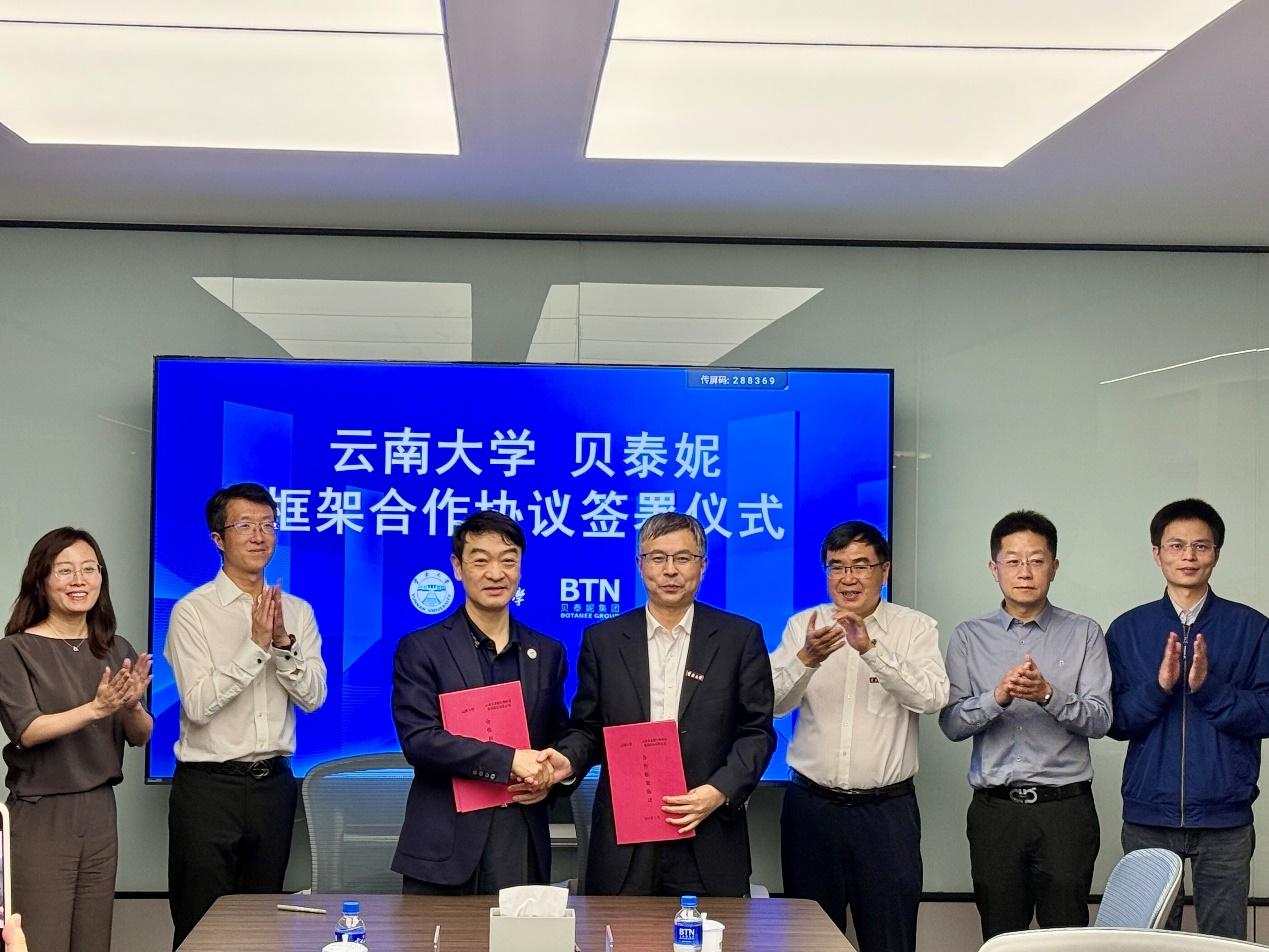 2025年9月30日,云南大学与云南贝泰妮生物科技集团股份有限公司签署框架合作协议。贝泰妮集团董事长、总裁郭振宇,研发副总裁王飞飞,云南大学校长马文会,副校长陈克清,以及双方相关职能部门、学校相关学院的负责人参加签约仪式。