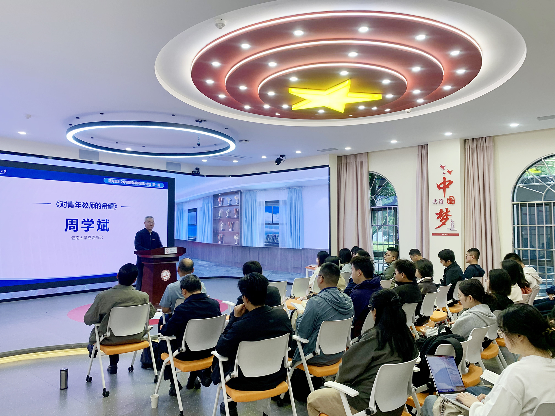 2025年5月24日,云南大学马克思主义学院“青年教师成长计划第一期”活动在学院沉浸式教育体验中心举办。本期活动以“教学能力提升:小课堂与大课堂”为主题。校党委书记周学斌讲话,马克思主义学院党政领导班子成员及全体青年教师参加。