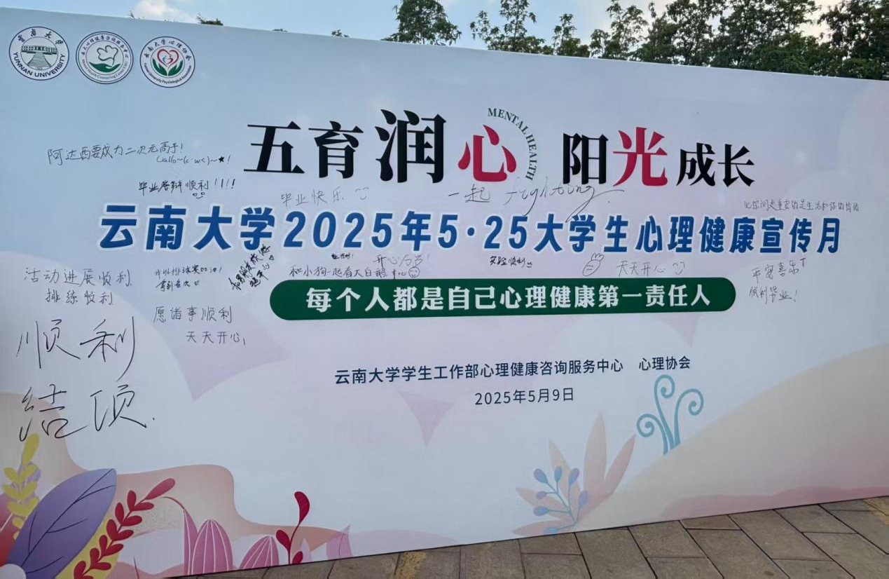 为培育大学生健康和谐、理性平和的积极心态,持续做好学校学生心理健康教育工作,云南大学学生工作部心理健康咨询服务中心于2025年5月举办了“五育润心 阳光成长”为主题的“5·25”心理健康宣传月活动,期间面向全校师生开展了主题丰富形式多样的活动,参与人数众多,深受广大师生的喜爱。